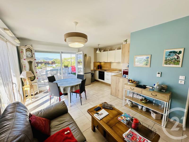 L'intérieur se compose d'un lumineux séjour avec une cuisine américaine entièrement équipée et aménagée, deux chambres avec de généreux espaces de rangement, une salle de bains moderne, ainsi qu'un WC indépendant pour votre commodité. Vous apprécierez également le confort de la climatisation réversible.
